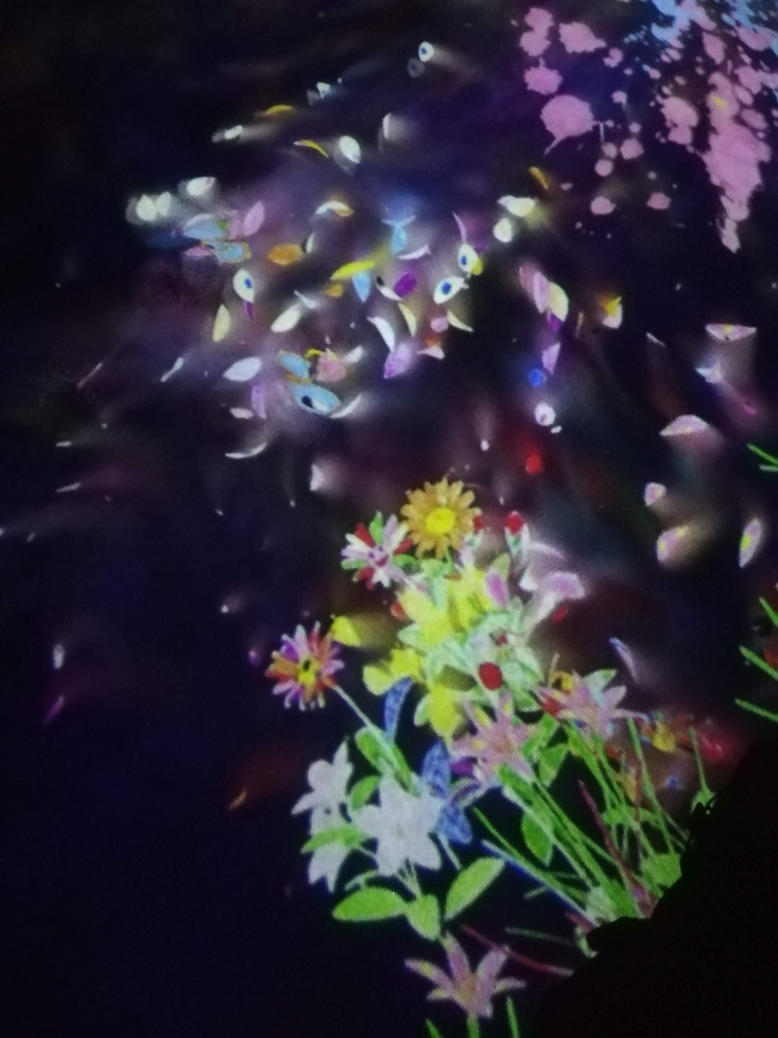 会場内に順路はなく、鑑賞者は足の向くまま大小様々な部屋をめぐる。迷路をたどっているようでもあり、前に見た部屋に入ることもあるが、時間がたつと投影される内容が変わっていたりして、果のない映像空間を彷徨っているような気持ちになる。中には人が触れることで変化したり、アプリ経由で光の操作ができるアートもあって面白い。