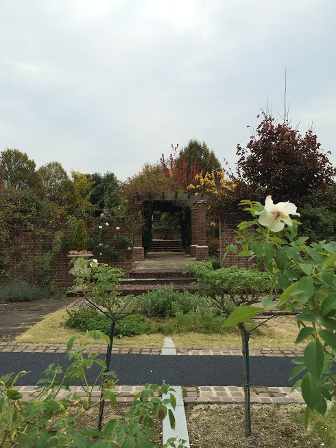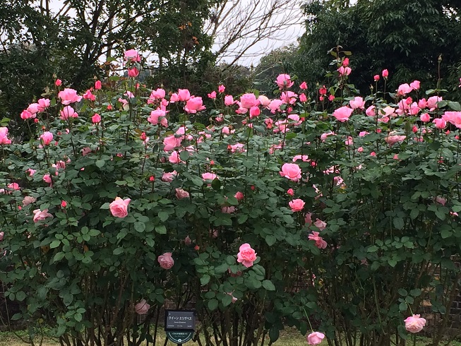 「バラのテーマガーデンの」の一画に、いかにもというレンガの壁に囲まれたイングリッシュガーデンがあり、その中にはロイヤルファミリーゆかりのバラを集めたコーナーがある。一番奥、上座(?)には、人の背丈より大きく育った「クイーン・エリザベス」が鎮座していた。麗しいピンクの花ですよ。(上記写真右側)