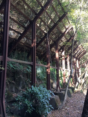 トンネルのさらに下には「玉野古道」という山道が通っていて、帰りはトンネルはくぐらず、そこを歩いてみた。というのも、廃線跡なので地面には線路の砂利がそのままのこされていて、けっこう歩きにくいのだ。しかし、山道も景色こそ絶景だが、木の根っこやくぼみが多く、やはり足場は悪いままだった。