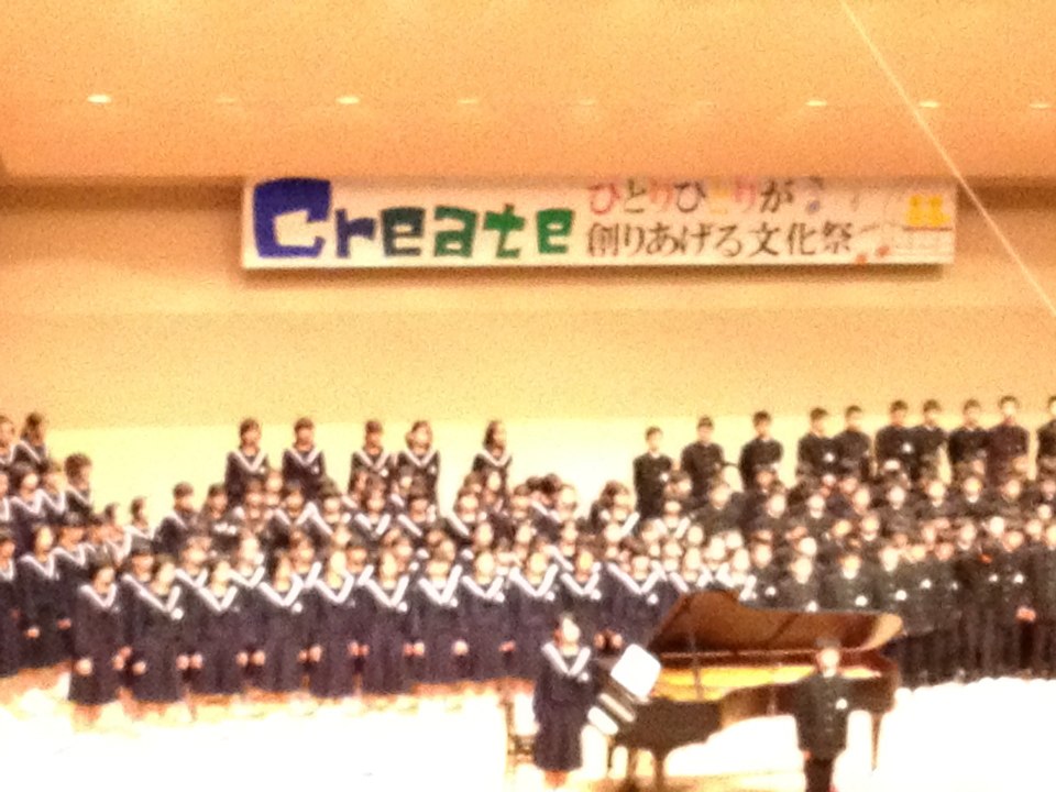 写真は、1年生の学年合唱の様子。まだまだ歌声がかわいらしい。3年にもなると鳥肌が立つ迫力になるのよ。