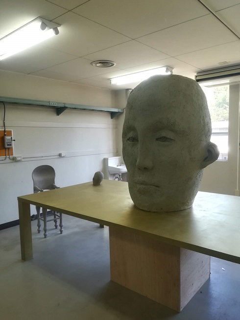 粘土でできた大小さまざまな人の頭部が点在する室内。不条理とはこのこと。