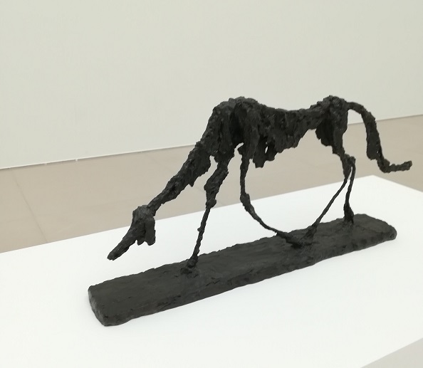 今ひとつ、つかみどころがないなあと思いつつ、最後の部屋に入ると、なんとイヌとネコがお迎えしてくれた。基本的に人間の像しか製作しなかったジャコメッティが残した、貴重な動物像だ。もちろん細い。