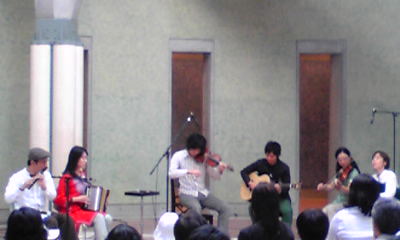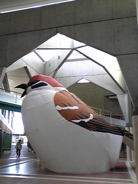 先日、アイリッシュセッションが開かれたその場所に、今度はこんな物体が登場した。隣に立つ人の大きさと比べるとわかると思うが、とにかく巨大なハリボテのスズメ。(娘が勝手にジョニー君と命名)遊園地などでよく見かける子供向けアトラクションと同じく、空気で膨らんでいる。これはアートの一種らしい。