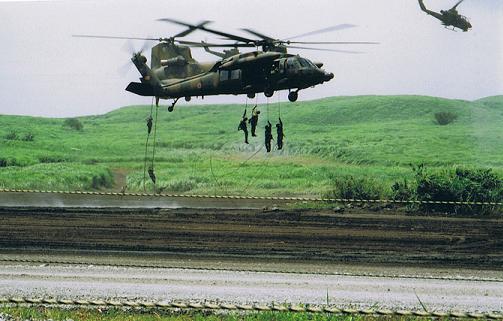 ヘリから戦闘部隊が降りてくるところ。