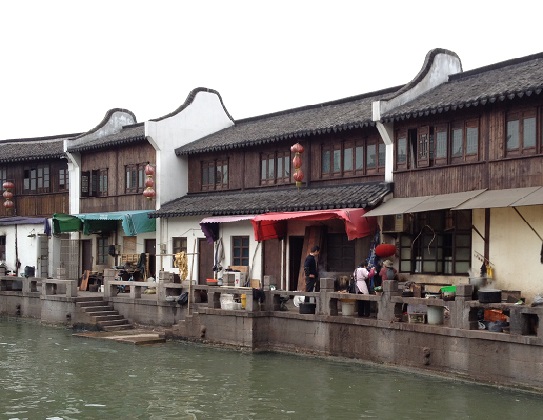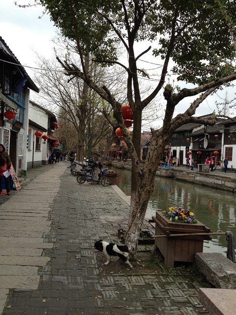 昼食は、客引きのおねいさんの迫力いや、けなげさに負けて橋のたもとの食堂で食事。運河のよく見える、2階の窓際の席に案内してもらう。ここは英語のわかる店員さんがいなくて焦ったが、さすが観光地、英語表記のついたメニュー表があって助かった。レン魚の蒸焼きと鳥肉の蒸焼きが美味しかった。炒飯もスープも大盛りで、150元で4人がお腹いっぱい。道を歩いていると放し飼いのイヌが多くて驚いたが、でもおりこうさんなことに、通行人には目もくれず縄張りを回り、用がすんだらちゃんと家に帰る。まるで見えないリードで飼い主とつながっているみたいだった。(ワンコの写真はクリックで大きくなります)