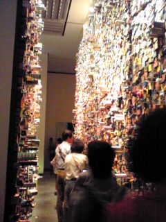 インドのアーティスト、ヘマ・ウパディヤイの作品。街のミニチュア模型で、かつて小学校の学習発表会で自分の街のミニチュアを作ったことを思い出した。小学生の作品と違うのは、混沌とした町並みを、細い通路の両脇に縦に並べて見せるというアイデア。鑑賞者は否応なく奇妙な圧迫感にさらされる。街がひしめき合うオブジェのかたまりに見えてくると同時に、細部を見るとやはり生活感漂う懐かしい空間であり、両者相まって、不思議なエネルギーを感じさせてくれる。