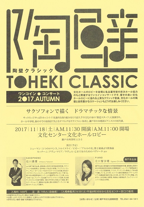 小雨降るある秋の土曜日、陶壁コンサート@瀬戸市文化センターを聞きに行ってきた。今年から始まった企画で、ホールのロビー内、巨大な陶壁画の前で定期的に行われるミニコンサート。